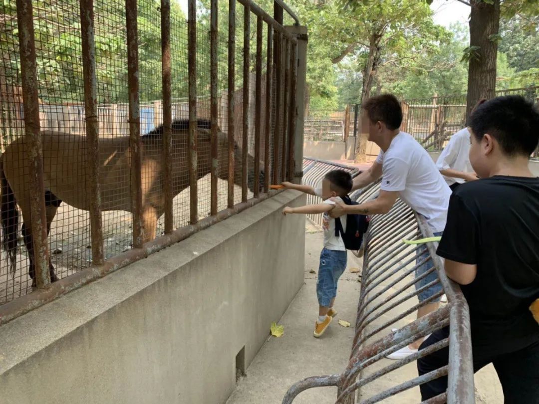 普氏野马围栏前,爸爸发现小儿子个头太矮,站在围栏外不管怎么努力伸长手臂都喂看到儿子有些胆怯,爸爸还在一旁还不断鼓励:“别害怕,你把胡萝卜再往里伸伸,要不然它够不着。”